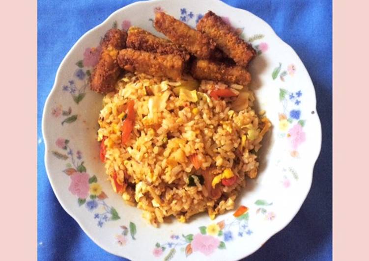 - Nasi goreng siap disajikan, oh iyaa biar rasanya tambah enak, saya tambahkan naget tempe sebagai hidangan pendamping :).